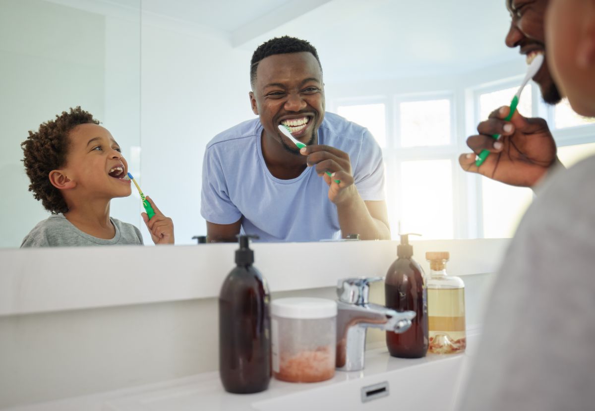 Dental, brushing teeth and father with son in bathroom for bonding, morning routine and cleaning. Teaching, self care and toothbrush with black man and child at home for wellness, fresh and hygiene.